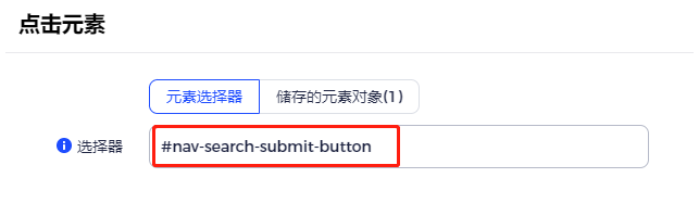 选择器是干什么用的呢? 顾名思义,选择就是从一堆东西里面,挑出自己想要的。而选择器,就是从丰富的网页元素里面,挑出我们想要的那个元素。 其实,“选择器”一词来源于网页开发中的层叠样式表 (Cascading Style Sheets,简称CSS)。别慌,在这里并不是让大家去学编程,写代码。而是让大家利用CSS选择器去定位元素(后文为了说明方便,统一简称为:选择器)。 举例,你想要用RPA去对某个按钮点击。 首先,要通过选择器去定位到这个按钮,然后再点击按钮。如果没有选择器,那么RPA就不知道该对网页的哪个元素去做操作。 如图所示,将选择器 #nav-search-submit-button 填入,RPA就会对网页中含有的元素进行点击。